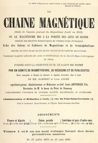 This was begun with the collaboration of Dupotet to continue the work of the baron's original Journal du Magnetisme (1845-1861). It was the practical organ of the French societies of masseurs and magnetizers. Papus, in his "Presses neo-spiritualistes," 1896, says that the journal was an "echo des salons magnetiques" of earlier times. It carried on a press war over the then current laws prohibiting the practice of magnetic medicine without a license-Auffinger's wife, a somnambule, had been condemned under the law. Also regularly criticized was Hector Durville and his new Journal du Magnetisme, which was a direct competitor of this journal and claimed to be the legitimate successor of Dupotet's Journal du Magnetisme. It also carried short articles on clairvoyance and clairaudience, on the "diables, demons, lutins, farfadets, revenants" that troubled human rest, and other related topics. (IAPSOP)