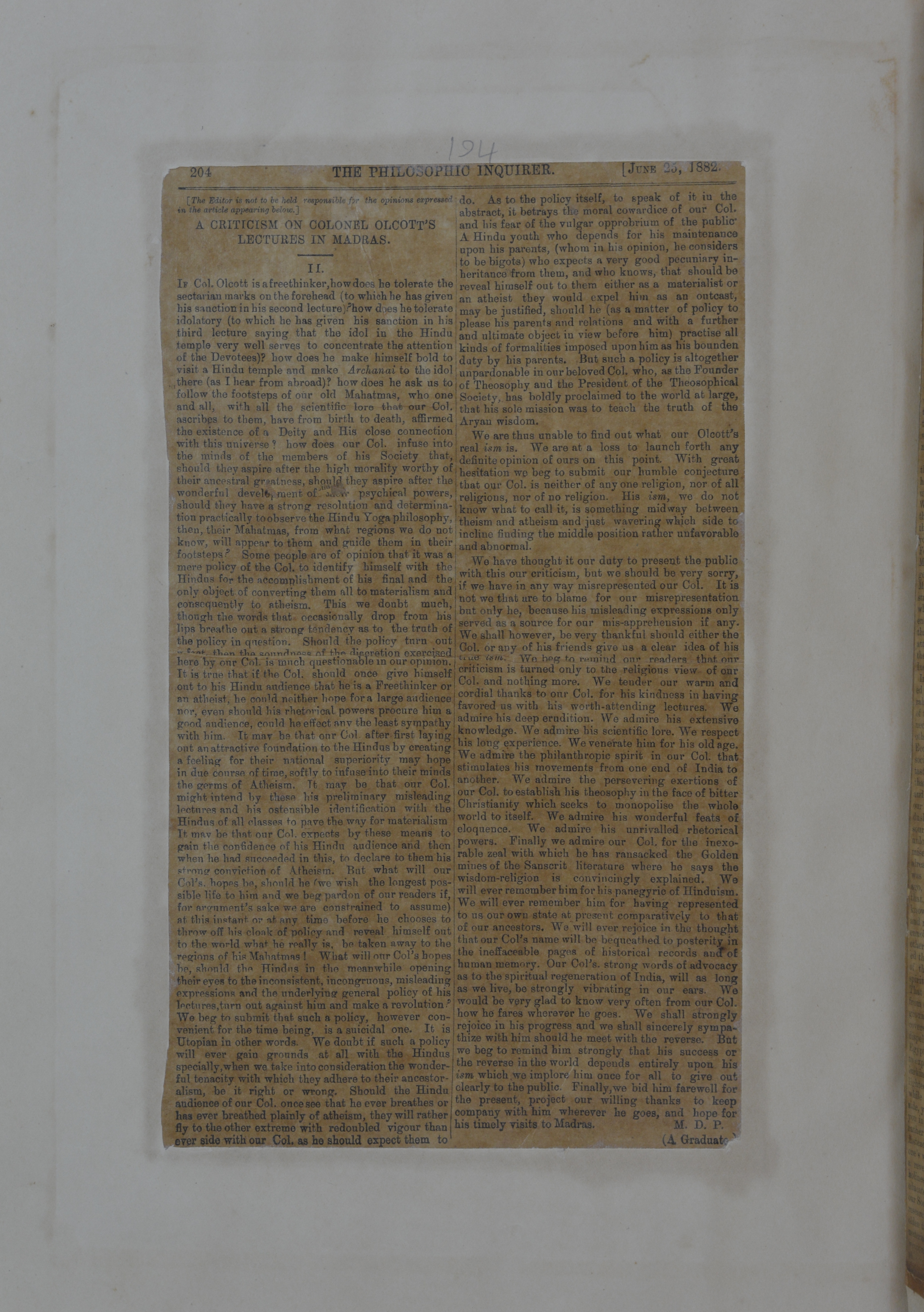 This file is a photo-copy of the page from Blavatsky H.P. Scrapbooks.